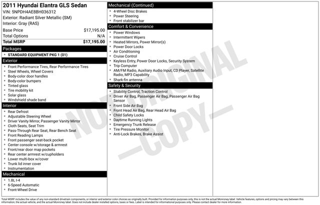 Discover the perfect balance of style, comfort, and efficiency in this 2011 Hyundai Elantra GLS. With its sleek silver exterior and a host of impressive features, this sedan is the ideal choice for the discerning driver.Boasting a comprehensive list of amenities, this Elantra GLS is designed to elevate your driving experience. Key highlights include:• CD player• Remote keyless entry• Security system• Heated door mirrors• 6 Speakers• AM/FM radio: XM• Radio: Autonet AM/FM/CD/MP3 w/XM Satellite• Rear Defroster• 60/40 Split Fold-Down Rear Seatback• Power steering• Power windows• Tire Pressure Monitoring System• ABS brakes• Dual front impact airbags• Dual front side impact airbagsUnder the hood, the Elantra GLS is powered by a 1.8L 4-Cylinder DOHC 16V Dual CVVT engine, delivering an impressive 28 city/38 highway MPG. This efficient powertrain, paired with the 6-Speed Automatic transmission with Overdrive, ensures a smooth and responsive ride, no matter the terrain.Stepping inside, you'll be greeted by a well-appointed interior, featuring premium cloth seating surfaces and a host of convenience features. The spacious cabin offers ample room for both passengers and cargo, making it the perfect companion for your daily commute or weekend adventures.Beyond the impressive list of features, the Elantra GLS also boasts a sleek and modern design that is sure to turn heads. The exterior's clean lines and striking silver hue exude a sense of sophistication, while the interior's thoughtful layout and premium materials create a welcoming and comfortable environment.At our dealership, we understand that finding the right vehicle is about more than just features and specifications. It's about finding a car that truly fits your lifestyle and exceeds your expectations. That's why we're confident that this 2011 Hyundai Elantra GLS is the perfect choice for discerning drivers like you.Don't miss your chance to experience the exceptional value and uncompromising quality of this remarkable sedan. Visit our showroom today and let us help you discover the perfect vehicle for your needs.