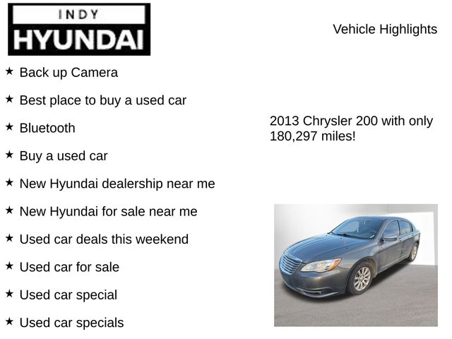 Recent Arrival! Back up Camera, Best place to buy a used car, Bluetooth, Buy a used car, New Hyundai dealership near me, New Hyundai for sale near me, Used car deals this weekend, Used car for sale, Used car special, Used car specials, Used cars near Indianapolis, Used cars near me, 200 Limited, 4D Sedan, 3.6L V6 24V VVT, FWD, Tungsten Metallic Clearcoat, Black Leather.Tungsten Metallic Clearcoat 2013 Chrysler 200 FWD Limited 3.6L V6 24V VVTAwards: * Ward's 10 Best Engines * 2013 IIHS Top Safety Pick * 2013 KBB.com Brand Image AwardsDiscover Your Perfect Vehicle at Bob Rohrman’s Indy Hyundai – Indianapolis’ Leading Dealership for New, Used, and Certified Pre-Owned Cars, SUVs, and Trucks Looking for your next car? At Bob Rohrman’s Indy Hyundai, we offer an unmatched selection of new, used, and certified pre-owned vehicles in Indianapolis, Indiana. Whether you’re after a spacious SUV, a rugged truck, or an efficient car, we’ve got all makes and models to suit your lifestyle. Shopping with us is easy—our team is dedicated to helping you find the perfect vehicle and making your car-buying experience smooth and hassle-free. With a great inventory and competitive pricing, we proudly serve customers throughout central Indiana. Stop by today for the best deals in town or explore our online inventory now.” Disclaimer: Vehicle descriptions, options, and trim levels may not be accurate due to automated processes.