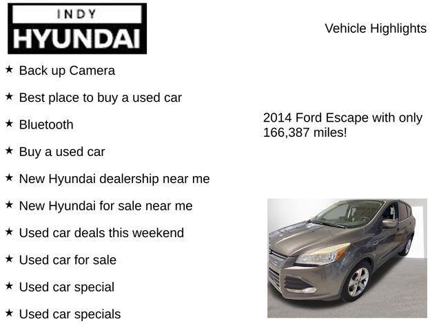 Back up Camera, Best place to buy a used car, Bluetooth, Buy a used car, New Hyundai dealership near me, New Hyundai for sale near me, Used car deals this weekend, Used car for sale, Used car special, Used car specials, Used cars near Indianapolis, Used cars near me, Four wheel independent suspension, Speed-sensing steering, Traction control.Sterling Gray Metallic 2014 Ford Escape FWD SE EcoBoost 1.6L I4 GTDi DOHC Turbocharged VCTAwards: * 2014 KBB.com 10 Best SUVs Under $25,000 * 2014 KBB.com Brand Image AwardsDiscover Your Perfect Vehicle at Bob Rohrman’s Indy Hyundai – Indianapolis’ Leading Dealership for New, Used, and Certified Pre-Owned Cars, SUVs, and Trucks Looking for your next car? At Bob Rohrman’s Indy Hyundai, we offer an unmatched selection of new, used, and certified pre-owned vehicles in Indianapolis, Indiana. Whether you’re after a spacious SUV, a rugged truck, or an efficient car, we’ve got all makes and models to suit your lifestyle. Shopping with us is easy—our team is dedicated to helping you find the perfect vehicle and making your car-buying experience smooth and hassle-free. With a great inventory and competitive pricing, we proudly serve customers throughout central Indiana. Stop by today for the best deals in town or explore our online inventory now.” Disclaimer: Vehicle descriptions, options, and trim levels may not be accurate due to automated processes.