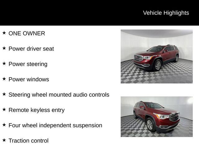 ONE OWNER, FWD, Jet Black Cloth, Four wheel independent suspension, Power driver seat, Power steering, Power windows, Remote keyless entry, Speed-sensing steering, Steering wheel mounted audio controls, Traction control.Clean CARFAX. Crimson Red Tintcoat 2017 GMC Acadia FWD SLE-2 3.6L V6 SIDI DOHC VVTOdometer is 2963 miles below market average!Awards: * 2017 IIHS Top Safety Pick with optional front crash prevention * 2017 KBB.com Brand Image AwardsDiscover Your Perfect Vehicle at Bob...