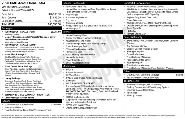 2020 GMC Acadia Denali Summit White AWD 3.6L V6 SIDIRecent Arrival! Clean CARFAX. CARFAX One Owner.• Technology Package with heads-up display and aerial view display • Dual moonroof/sunroof • Adaptive cruise control, navigation system, and heated seats • Blind spot monitor and cross-traffic alert • Heated and cooled front seats with memory settings • Power driver and passenger seats with adjustable lumbar • Heated rear seats • Rear parking sensors and backup camera • Power liftgate and...
