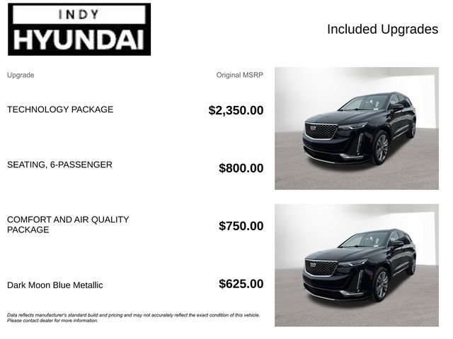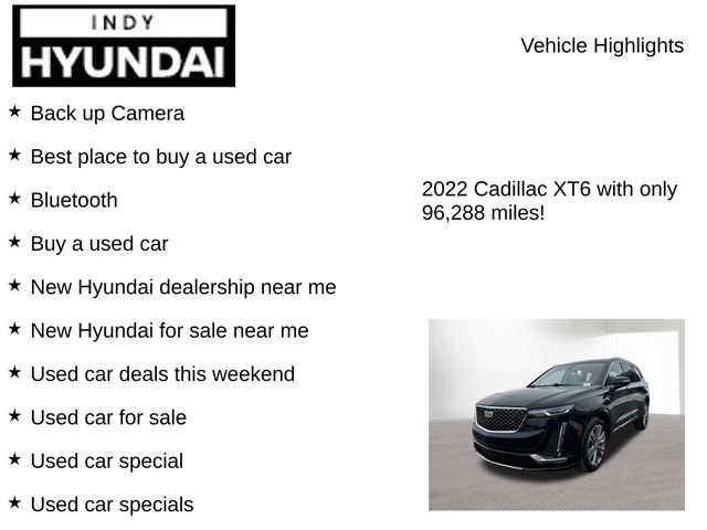 Back up Camera, Best place to buy a used car, Bluetooth, Buy a used car, New Hyundai dealership near me, New Hyundai for sale near me, Used car deals this weekend, Used car for sale, Used car special, Used car specials, Used cars near Indianapolis, Used cars near me, XT6 Premium Luxury, 4D Sport Utility, 3.6L V6 DI VVT, 9-Speed Automatic, AWD, Dark Moon Blue Metallic, Cirrus Leather.CARFAX One-Owner. Clean CARFAX. Dark Moon Blue Metallic 2022 Cadillac XT6 AWD Premium Luxury 3.6L V6 DI VVTAwards: * 2022 IIHS Top Safety Pick+Discover Your Perfect Vehicle at Bob Rohrman’s Indy Hyundai – Indianapolis’ Leading Dealership for New, Used, and Certified Pre-Owned Cars, SUVs, and Trucks Looking for your next car? At Bob Rohrman’s Indy Hyundai, we offer an unmatched selection of new, used, and certified pre-owned vehicles in Indianapolis, Indiana. Whether you’re after a spacious SUV, a rugged truck, or an efficient car, we’ve got all makes and models to suit your lifestyle. Shopping with us is easy—our team is dedicated to helping you find the perfect vehicle and making your car-buying experience smooth and hassle-free. With a great inventory and competitive pricing, we proudly serve customers throughout central Indiana. Stop by today for the best deals in town or explore our online inventory now.” Disclaimer: Vehicle descriptions, options, and trim levels may not be accurate due to automated processes.