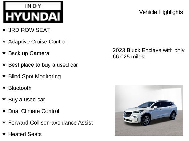 3RD ROW SEAT, Adaptive Cruise Control, Back up Camera, Best place to buy a used car, Blind Spot Monitoring, Bluetooth, Buy a used car, Dual Climate Control, Forward Collison-avoidance Assist, Heated Seats, Keyless Entry, KEYLESS START, Lane Keeping Assist, LEATHER SEATS, NAVIGATION, New Hyundai dealership near me, New Hyundai for sale near me, Panoramic Sunroof, Portable Audio Connection, Power Seats, Premium Audio, Premium Wheels, Rear Cross Traffic Alert, Remote Start, Security System, Sunroof, Tow Package, USB PORT, Used car deals this weekend, Used car for sale, Used car special, Used car specials, Used cars near Indianapolis, Used cars near me, Enclave Premium Group, 4D Sport Utility, 3.6L V6 SIDI VVT, 9-Speed Automatic, FWD, White Frost Tricoat, Dark Galvanized With Ebony Interior Accents Leather, Wireless Apple CarPlay/Wireless Android Auto.Priced below KBB Fair Purchase Price! CARFAX One-Owner. Clean CARFAX. White Frost Tricoat 2023 Buick Enclave FWD Premium Group 3.6L V6 SIDI VVTDiscover Your Perfect Vehicle at Bob Rohrman’s Indy Hyundai – Indianapolis’ Leading Dealership for New, Used, and Certified Pre-Owned Cars, SUVs, and Trucks Looking for your next car? At Bob Rohrman’s Indy Hyundai, we offer an unmatched selection of new, used, and certified pre-owned vehicles in Indianapolis, Indiana. Whether you’re after a spacious SUV, a rugged truck, or an efficient car, we’ve got all makes and models to suit your lifestyle. Shopping with us is easy—our team is dedicated to helping you find the perfect vehicle and making your car-buying experience smooth and hassle-free. With a great inventory and competitive pricing, we proudly serve customers throughout central Indiana. Stop by today for the best deals in town or explore our online inventory now.” Disclaimer: Vehicle descriptions, options, and trim levels may not be accurate due to automated processes.
