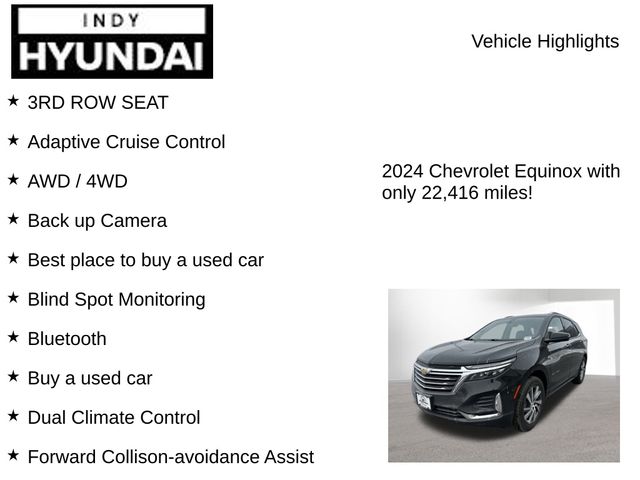 3RD ROW SEAT, Adaptive Cruise Control, AWD / 4WD, Back up Camera, Best place to buy a used car, Blind Spot Monitoring, Bluetooth, Buy a used car, Dual Climate Control, Forward Collison-avoidance Assist, Heated Seats, Keyless Entry, KEYLESS START, Lane Keeping Assist, LEATHER SEATS, New Hyundai dealership near me, New Hyundai for sale near me, Portable Audio Connection, Power Seats, Premium Wheels, Rear Cross Traffic Alert, Remote Start, Security System, Used car deals this weekend, Used car for sale, Used car special, Used car specials, Used cars near Indianapolis, Used cars near me, Equinox Premier, 4D Sport Utility, 1.5L DOHC, 6-Speed Automatic Electronic with Overdrive, AWD, Mosaic Black Metallic, Jet Black Leather.Priced below KBB Fair Purchase Price! Mosaic Black Metallic 2024 Chevrolet Equinox AWD Premier 1.5L DOHCOdometer is 8219 miles below market average!Discover Your Perfect Vehicle at Bob Rohrman’s Indy Hyundai – Indianapolis’ Leading Dealership for New, Used, and Certified Pre-Owned Cars, SUVs, and Trucks Looking for your next car? At Bob Rohrman’s Indy Hyundai, we offer an unmatched selection of new, used, and certified pre-owned vehicles in Indianapolis, Indiana. Whether you’re after a spacious SUV, a rugged truck, or an efficient car, we’ve got all makes and models to suit your lifestyle. Shopping with us is easy—our team is dedicated to helping you find the perfect vehicle and making your car-buying experience smooth and hassle-free. With a great inventory and competitive pricing, we proudly serve customers throughout central Indiana. Stop by today for the best deals in town or explore our online inventory now.” Disclaimer: Vehicle descriptions, options, and trim levels may not be accurate due to automated processes.