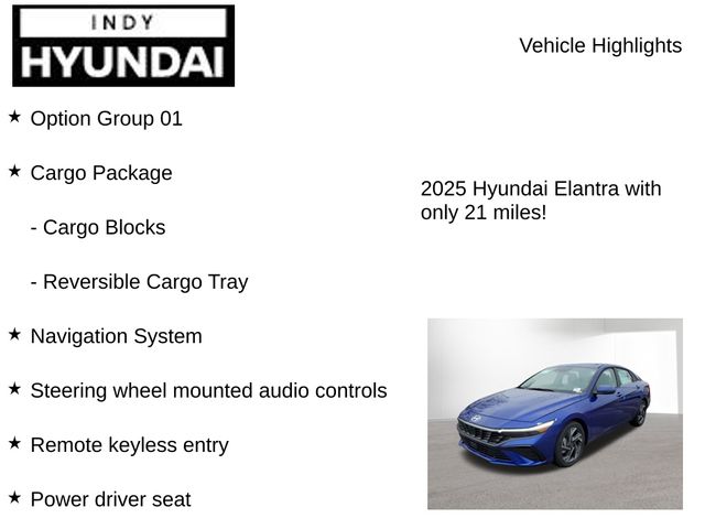 Discover the perfect blend of style, technology, and performance in the 2025 Hyundai Elantra Limited. This captivating sedan is designed to elevate your driving experience, offering a harmonious combination of modern amenities and exceptional efficiency.Meticulously crafted with your needs in mind, the Elantra Limited boasts an impressive array of features, including:• Reversible Cargo Tray• Cargo Side Bins• Cargo Net• First Aid Kit• Cargo Package• Option Group 01• Navigation System• 8 Speakers• Radio: AM/FM/HD/SiriusXM Display Audio• Automatic temperature control• Front dual zone A/C• Power driver seat• Remote keyless entry• Steering wheel mounted audio controls• 4-Wheel Disc BrakesBeneath its sleek, blue exterior lies a heart that beats with power and efficiency. The Elantra Limited's I4 engine and CVT transmission deliver a smooth and responsive driving experience, while the front-wheel-drive configuration ensures confident handling on the open road. With an impressive 30 city MPG and 39 highway MPG, this sedan offers the perfect balance of performance and fuel economy.Step inside the Elantra Limited and be captivated by its sophisticated interior. The H-Tex Leatherette Seats and Heated Front Bucket Seats provide unparalleled comfort, while the Power Moonroof and Auto High-beam Headlights add a touch of elegance to your daily commute. The Cargo Blocks and Reversible Cargo Tray ensure your belongings are securely stored, while the Cargo Net keeps everything organized.Connectivity is at your fingertips with the Elantra Limited's cutting-edge technology. Apple CarPlay and Android Auto seamlessly integrate your smartphone, allowing you to access your favorite apps, music, and more. The 8-speaker audio system delivers a captivating listening experience, while the Navigation System guides you effortlessly to your destination.Safety is of the utmost importance, and the Elantra Limited delivers with a comprehensive suite of advanced safety features. Dual front impact airbags, dual front side impact airbags, and an emergency communication system provide peace of mind on every journey.Experience the exceptional craftsmanship and uncompromising performance of the 2025 Hyundai Elantra Limited. Discover the perfect blend of style, technology, and efficiency that will elevate your driving experience. Visit our showroom today and let us help you find the Elantra Limited that's tailored to your needs. Price includes: $1250 - Hyundai HMF Dealer Choice : $1250 discount and 5.99% APR for 24 months. $44.32 per $1000 financed. Available to well qualified buyers who finance through Hyundai Motor Finance. H704. Exp. 09/02/2025