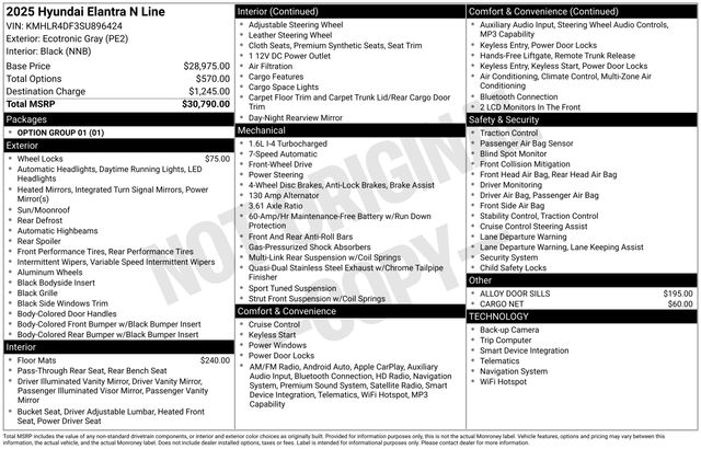 Elevate your driving experience with the 2025 Hyundai Elantra N Line. This dynamic and stylish sedan is the perfect blend of performance, technology, and comfort, designed to exceed your expectations.Indulge in a host of premium features that will elevate your daily commute:• Back up Camera• USB PORT• Remote Start• Sunroof• Premium Wheels• Heated Seats• LEATHER SEATS• Bluetooth• CARPETED FLOOR MATS• ALLOY DOOR SILLS• WHEEL LOCKS• CARGO NET• Option Group 01But the true heart of this Elantra N Line lies in its exceptional performance. Equipped with a powerful I4 engine and a 7-Speed Dual Clutch DCT, this sedan delivers an exhilarating driving experience with an impressive fuel efficiency of 28 MPG in the city and 35 MPG on the highway.Beyond the thrilling performance, the 2025 Elantra N Line is packed with cutting-edge technology that will keep you connected and entertained. Enjoy the seamless integration of Apple CarPlay and Android Auto, the convenience of the Navigation System, and the rich sound of the 8-Speaker audio system. The automatic temperature control and power driver's seat ensure your comfort, while the Auto High-beam Headlights and Exterior Parking Camera Rear provide added safety and confidence on the road.Elevate your driving experience with the 2025 Hyundai Elantra N Line. This sedan is the perfect blend of style, performance, and technology, designed to exceed your expectations and take your daily commute to new heights. With its impressive features and exceptional value, the Elantra N Line is the ultimate choice for the discerning driver.But don't just take our word for it. Come experience the thrill of the Elantra N Line for yourself. Visit our showroom today and let our knowledgeable team guide you through all the features and capabilities of this remarkable vehicle. We're confident that once you take it for a test drive, you'll be convinced that the 2025 Hyundai Elantra N Line is the perfect car for you. Price includes: $750 - Hyundai HMF Dealer Choice : $750 discount and 5.49% APR for 24 months. $44.09 per $1000 financed. Available to well qualified buyers who finance through Hyundai Motor Finance. H704. Exp. 12/01/2025