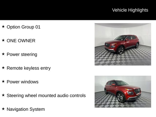 ONE OWNER, Navigation System, Option Group 01, Power steering, Power windows, Remote keyless entry, Steering wheel mounted audio controls.Priced below KBB Fair Purchase Price! CARFAX One-Owner. Clean CARFAX. Ultimate Red 2025 Hyundai Venue FWD Limited Certified. I4Odometer is 2393 miles below market average!Hyundai Details: * Powertrain Limited Warranty: 120 Month/100,000 Mile (whichever comes first) from original in-service date (for Hyundai Certified Used Vehicles program) * Vehicle History...