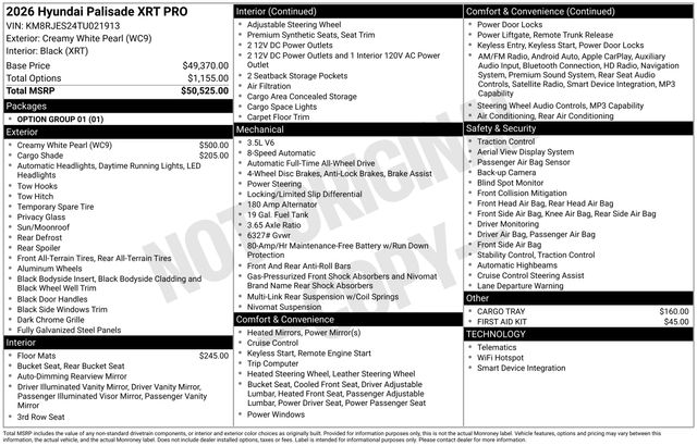 $3,014 off MSRP! Creamy White Pearl 2026 Hyundai Palisade XRTPalisade XRT is nicely equipped with Option Group 01, 14 Speakers, 3rd row seats: split-bench, 4-Wheel Disc Brakes, ABS brakes, Air Conditioning, Alloy wheels, AM/FM radio: SiriusXM, Apple CarPlay & Android Auto, Auto High-beam Headlights, Auto-dimming door mirrors, Auto-dimming Rear-View mirror, Auto-leveling suspension, Automatic temperature control, Brake assist, Cargo Cover, Cargo Tray, Carpeted Floor Mats, Compass, Delay-off...